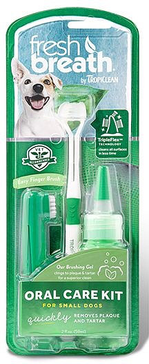 Tripleflex toothbrush for 360 degree cleaning, fingerbrush for gentle cleaning, and brushing gel. Small